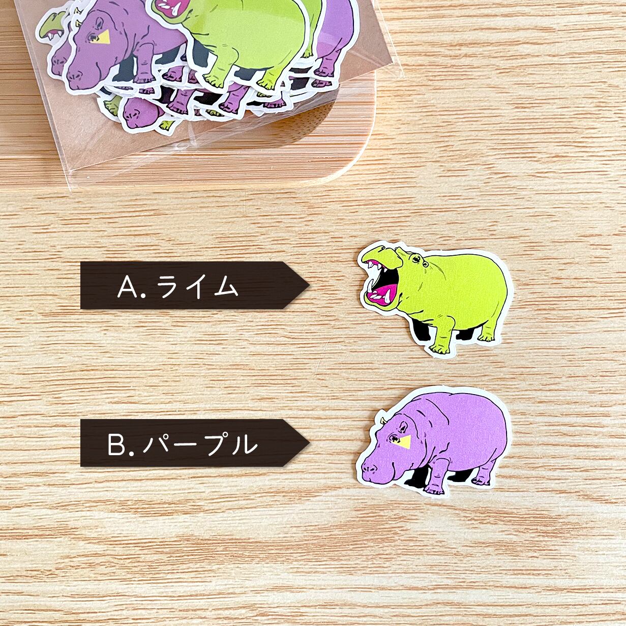 ポップなカラーが可愛いカバのフレークシールです。