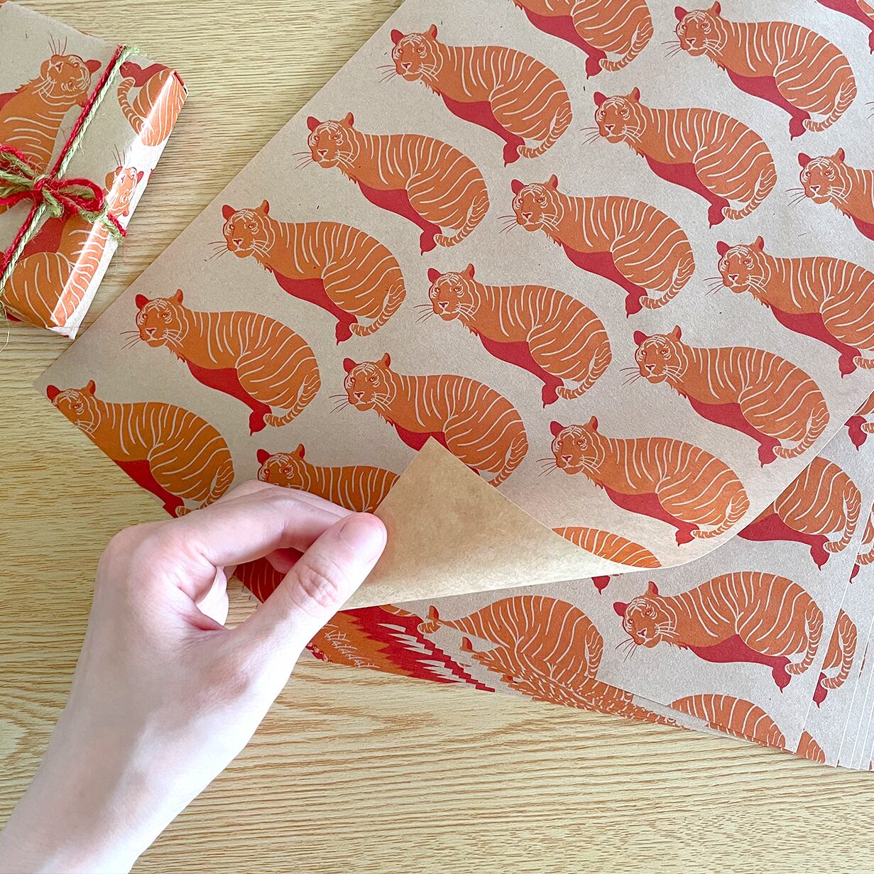 こちらを振り向く可愛らしい虎の姿をほどよくリアルに描き、おしゃれなデザインペーパーに仕上げました。