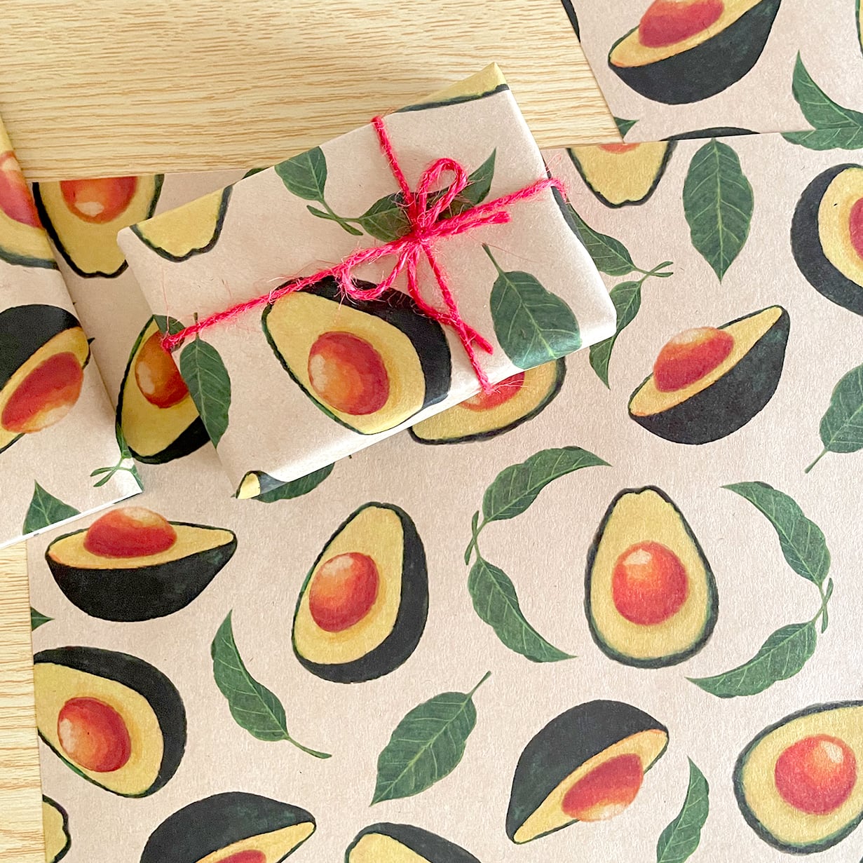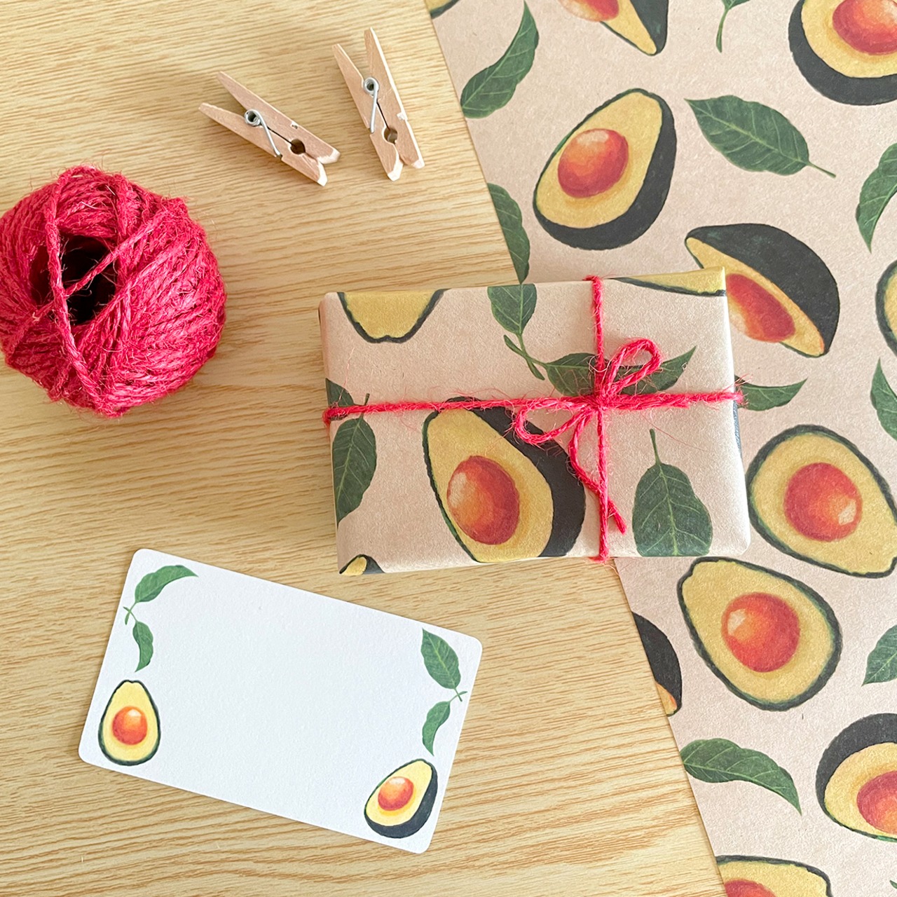 深みのあるグリーンで描いたアボカドのイラストを華やかに配置し、レトロ感あるおしゃれなペーパーに仕上げました。