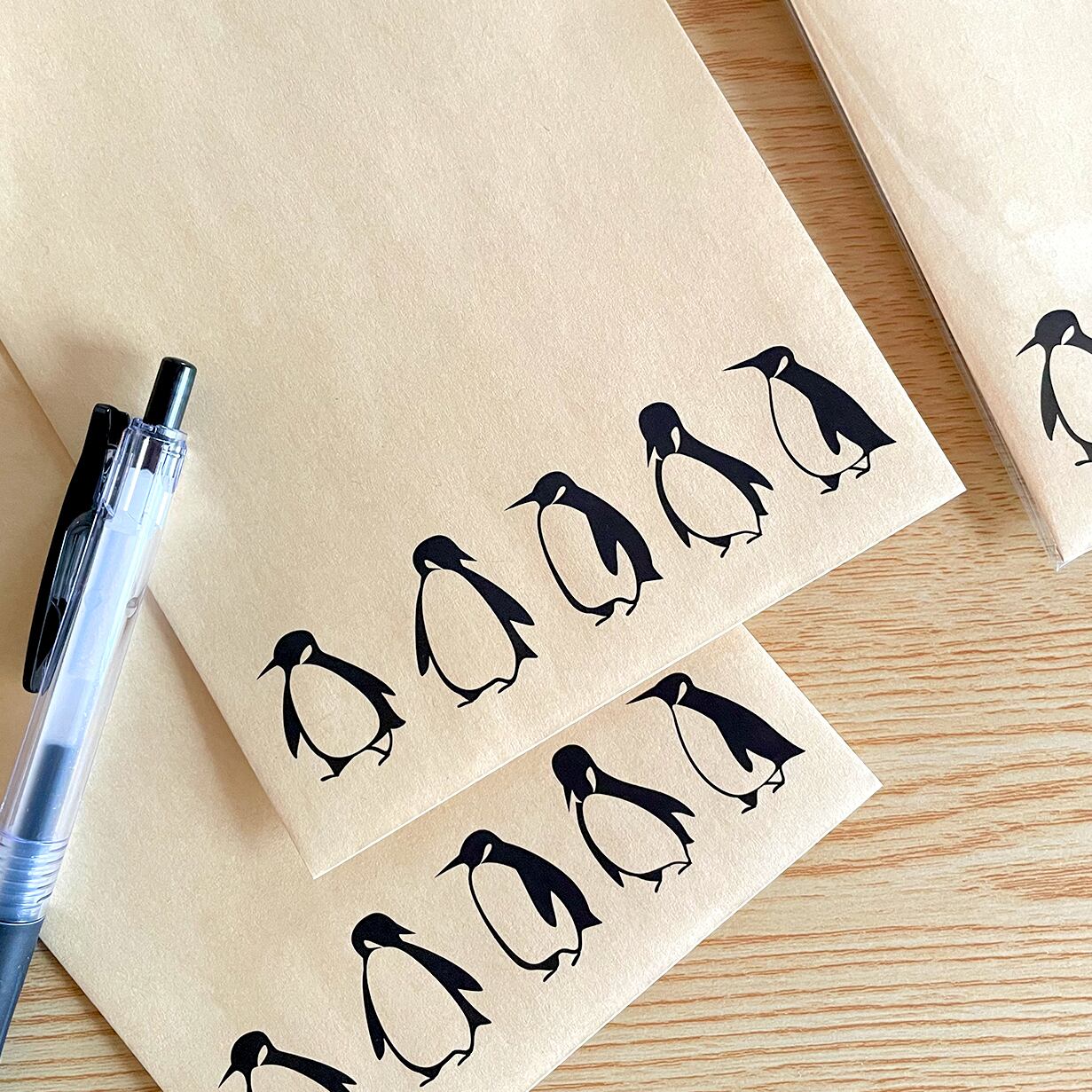 クラフト紙の素朴な風合いと、ペンギンのイラストの絶妙なゆるさが相まって、ちょっとしたお便りや贈り物に、くすっと笑えるアクセントを添えてくれます。