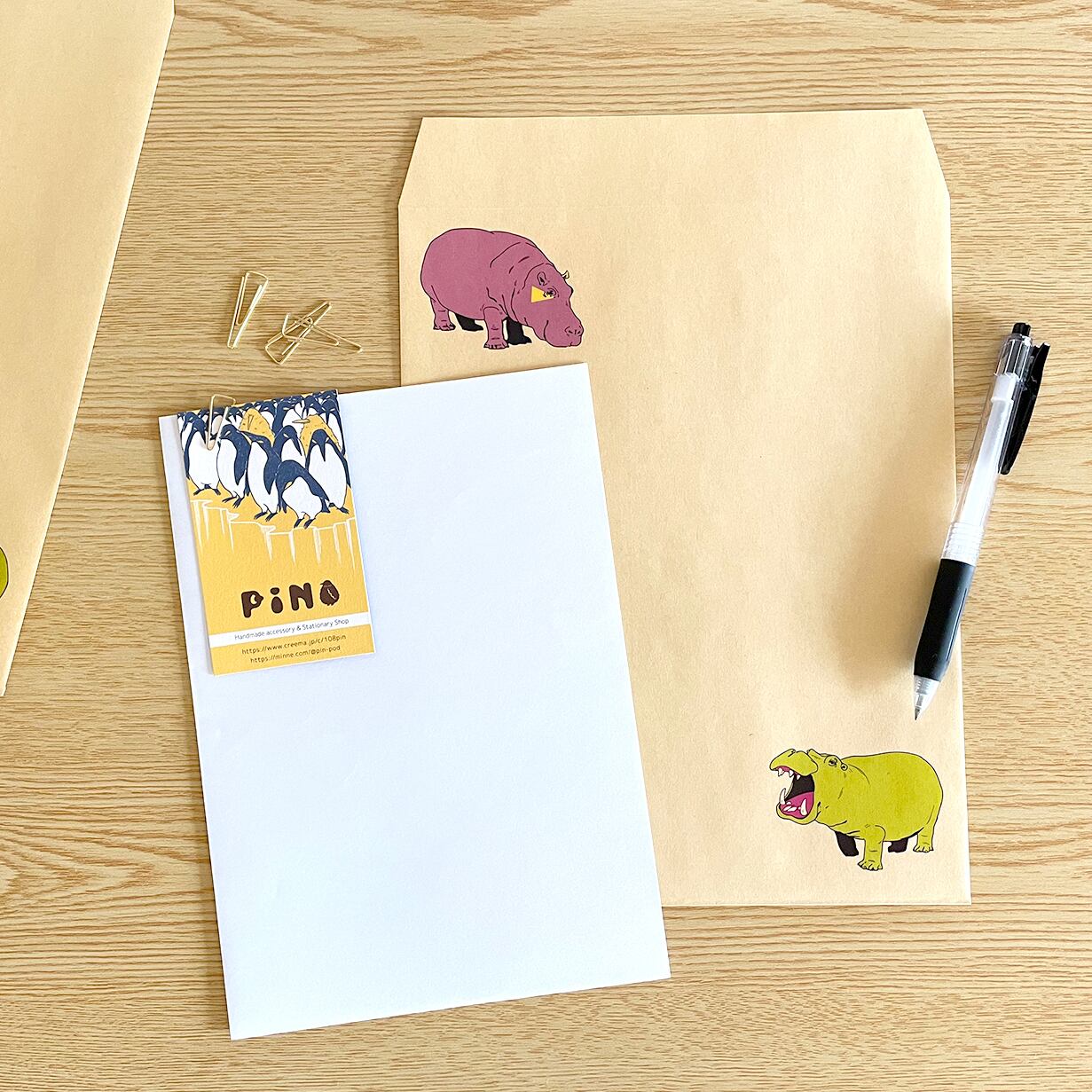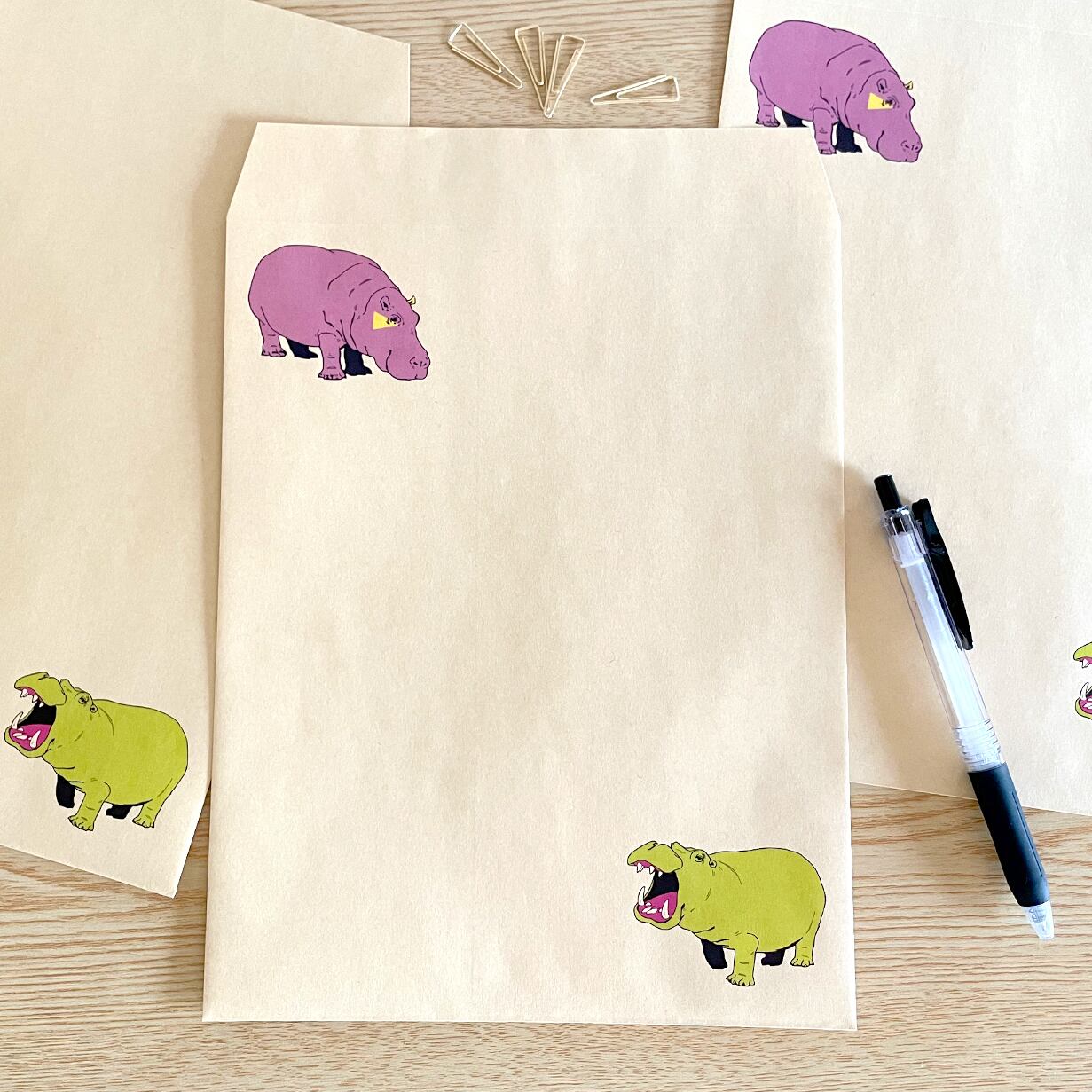 クラフト紙の素朴な風合いと、カバのイラストの絶妙なゆるさが相まって、ちょっとしたお便りや贈り物に、くすっと笑えるアクセントを添えてくれます。