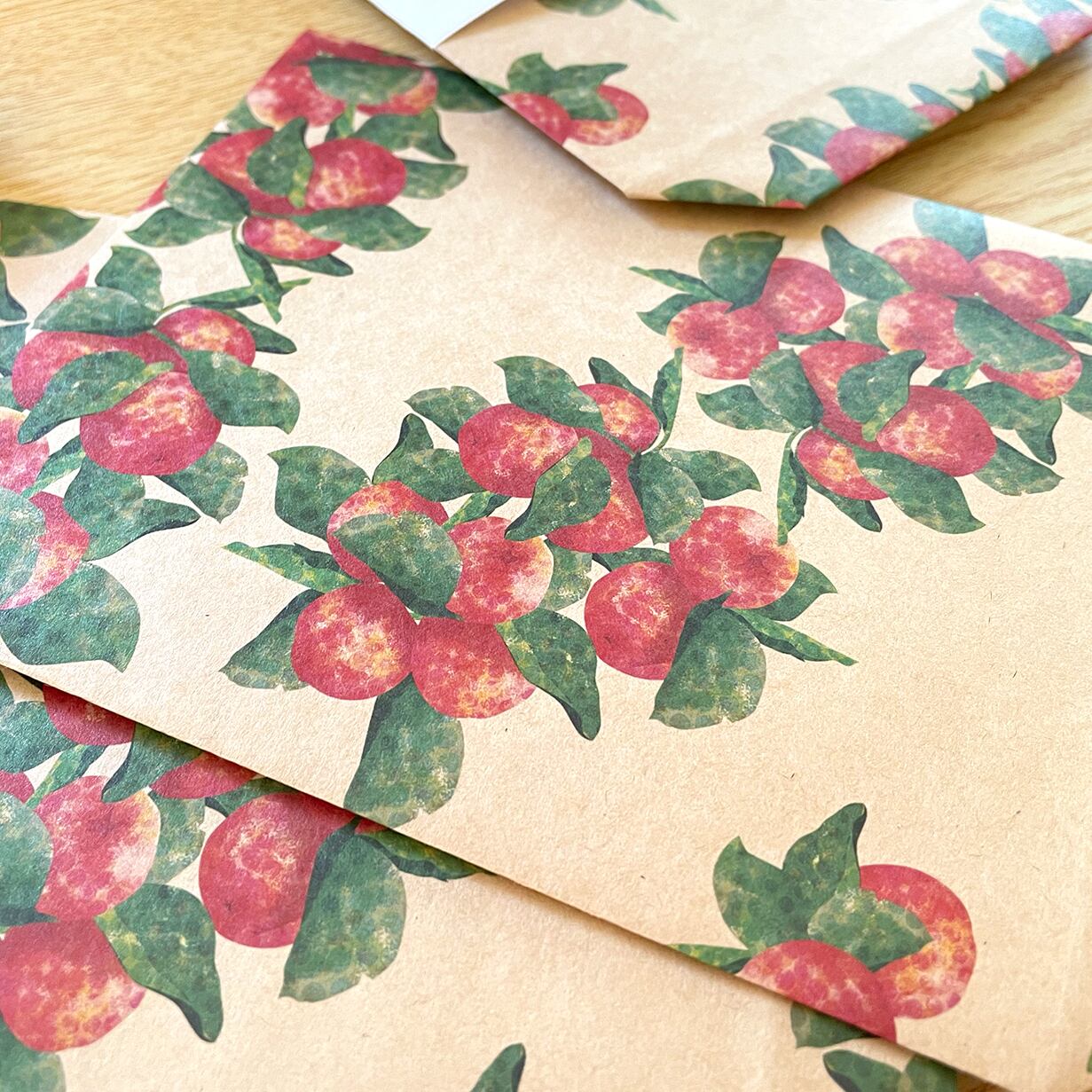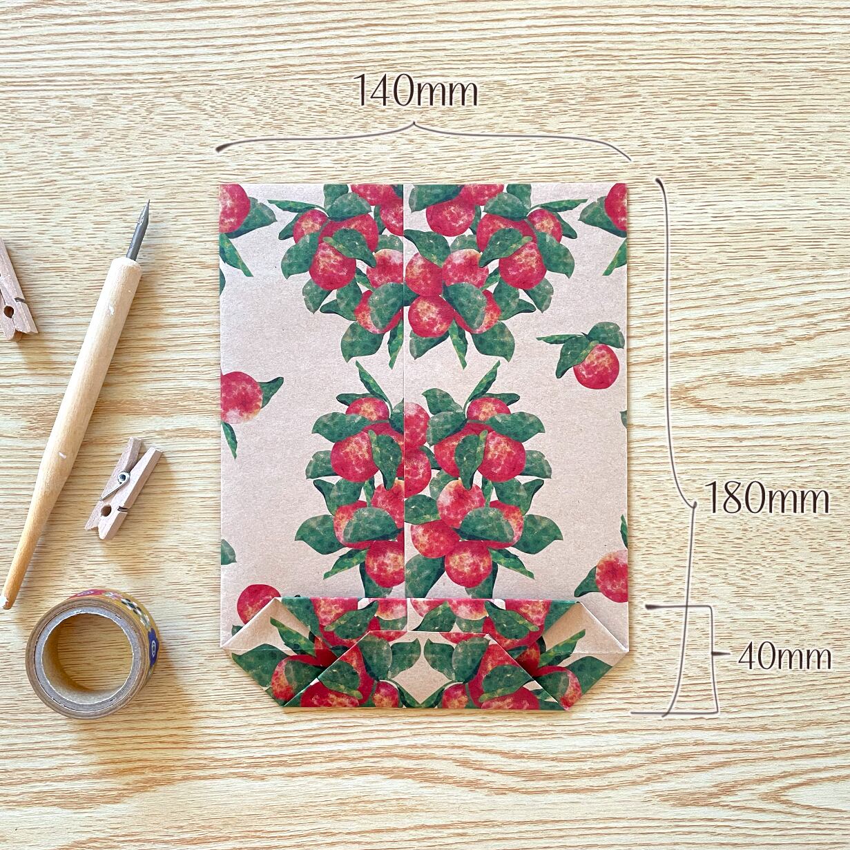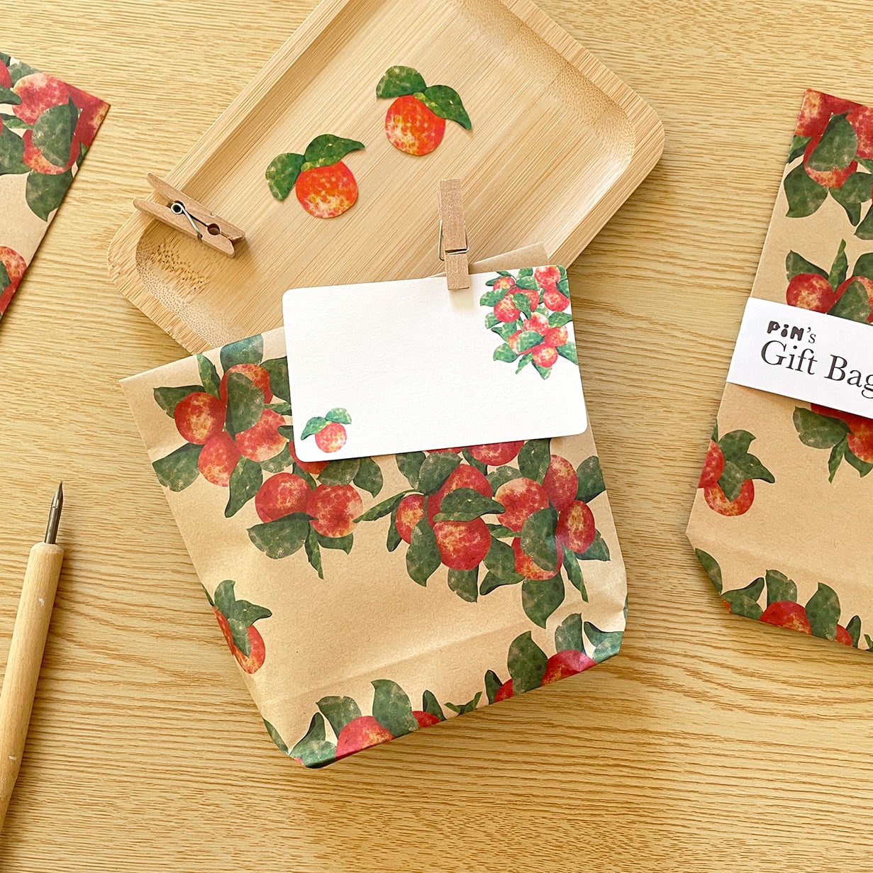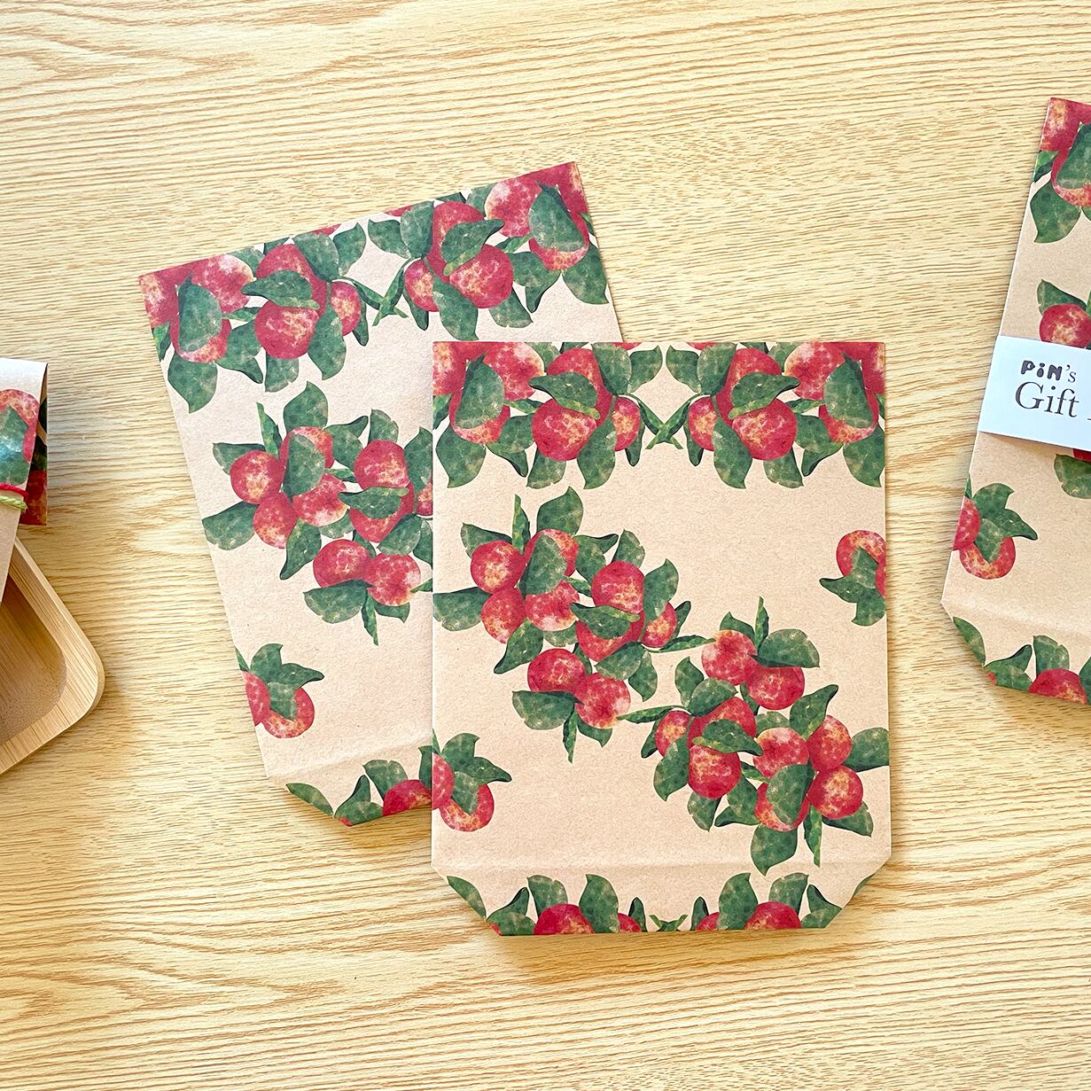 小物のラッピングにちょうどいい、おしゃれな林檎柄のギフトバッグです。