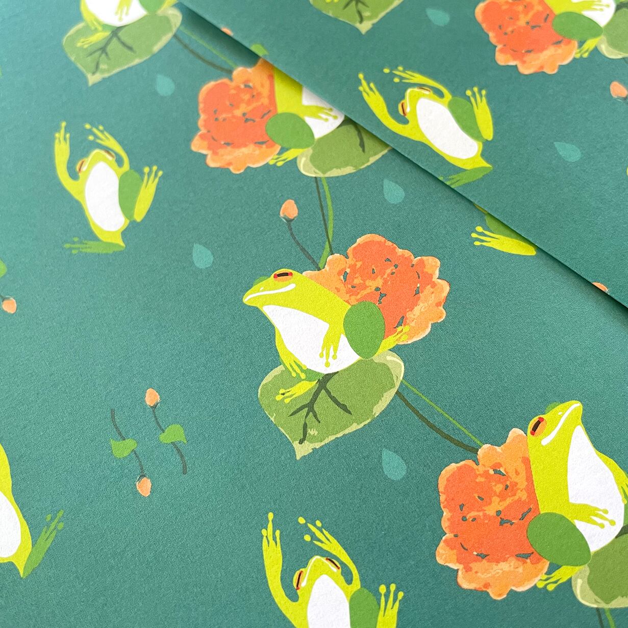 落ち着きのあるブルーグリーンに蛙とお花が映えるデザインで、受け取った方にも明るい気持ちになっていただけます。