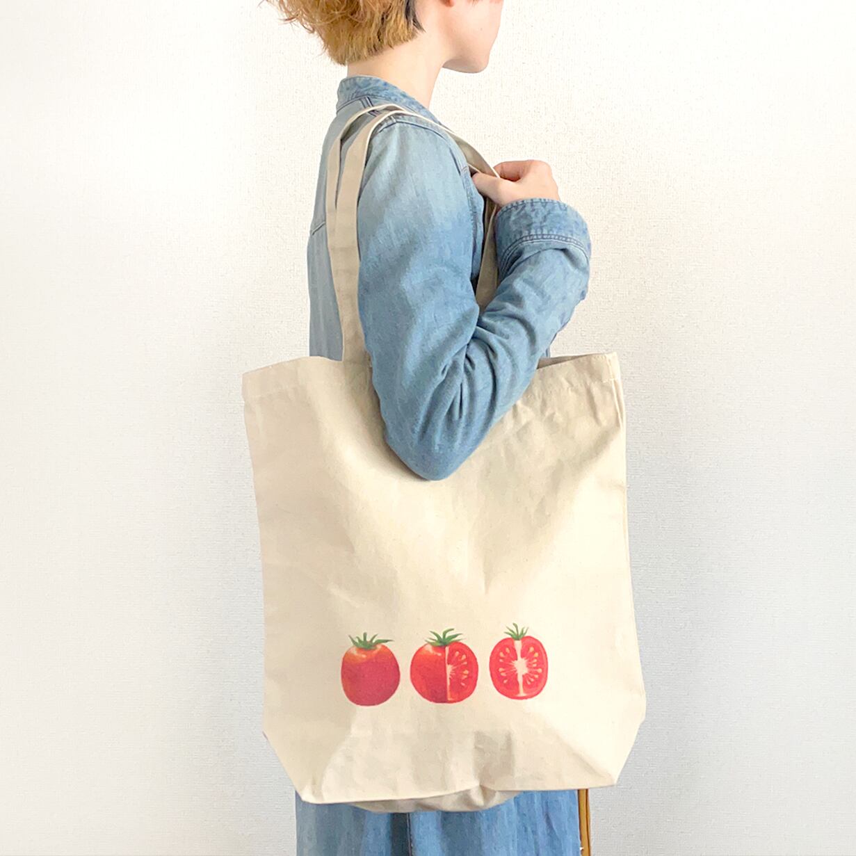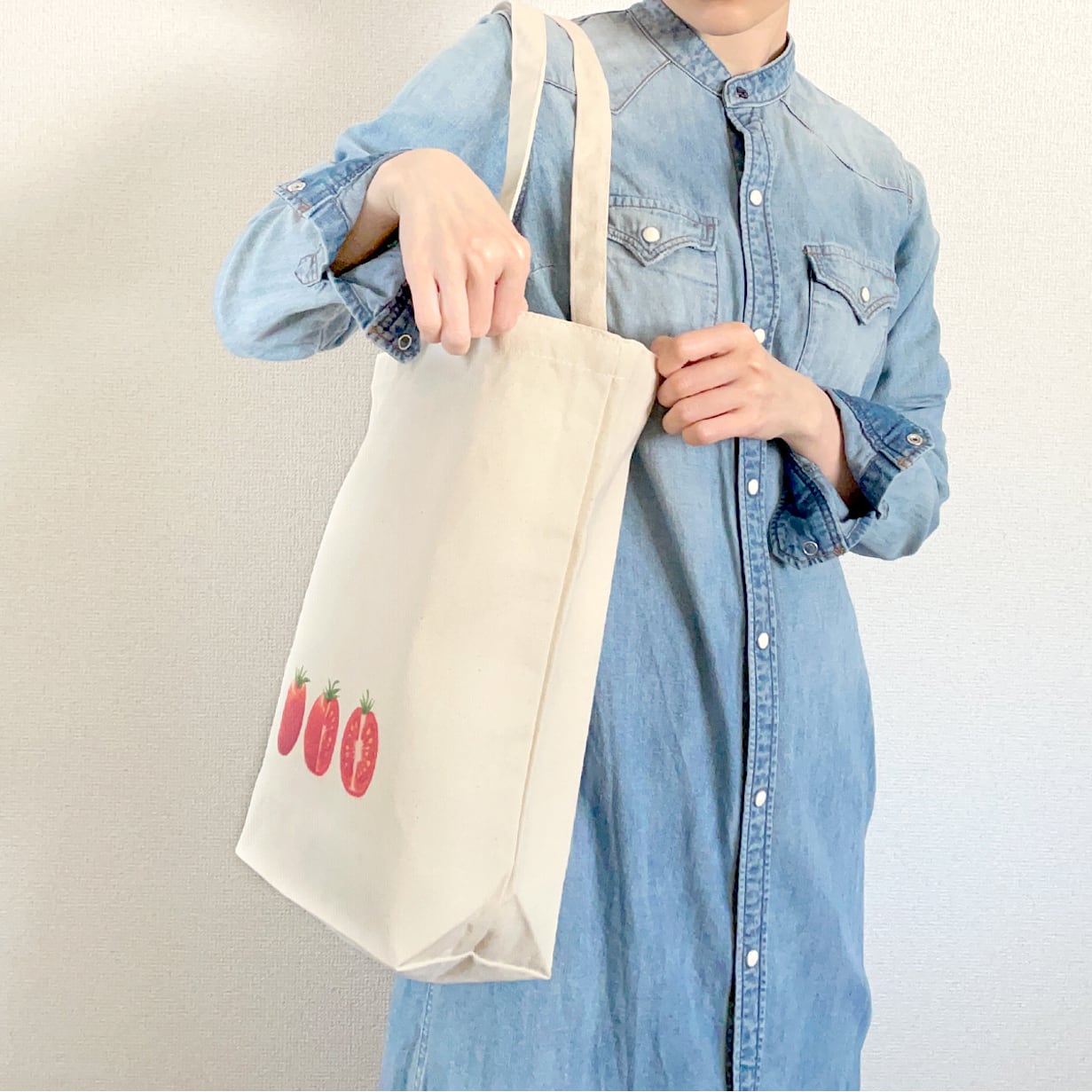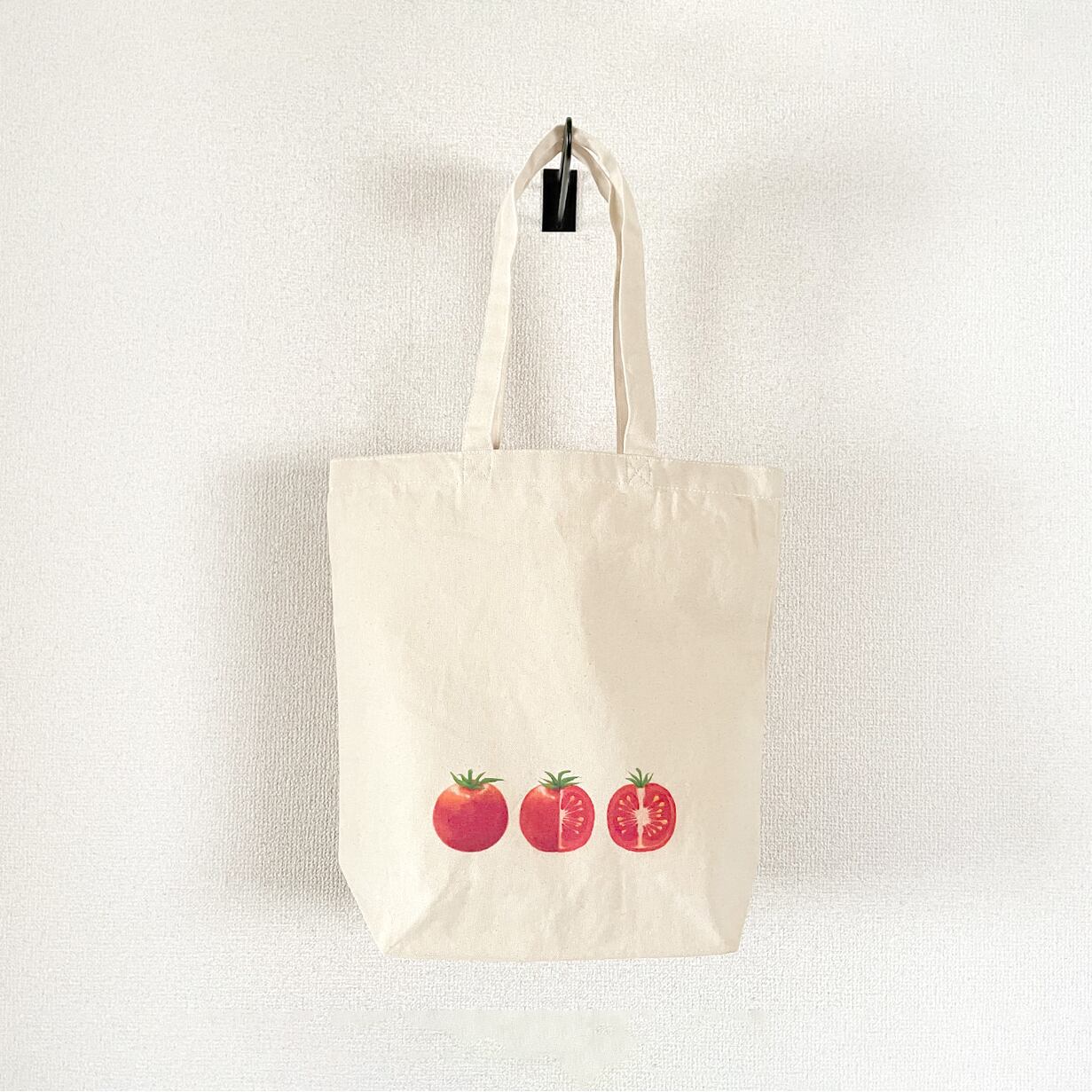 生成りの帆布に真っ赤なトマトの実が映える、可愛らしいトートバッグです。
