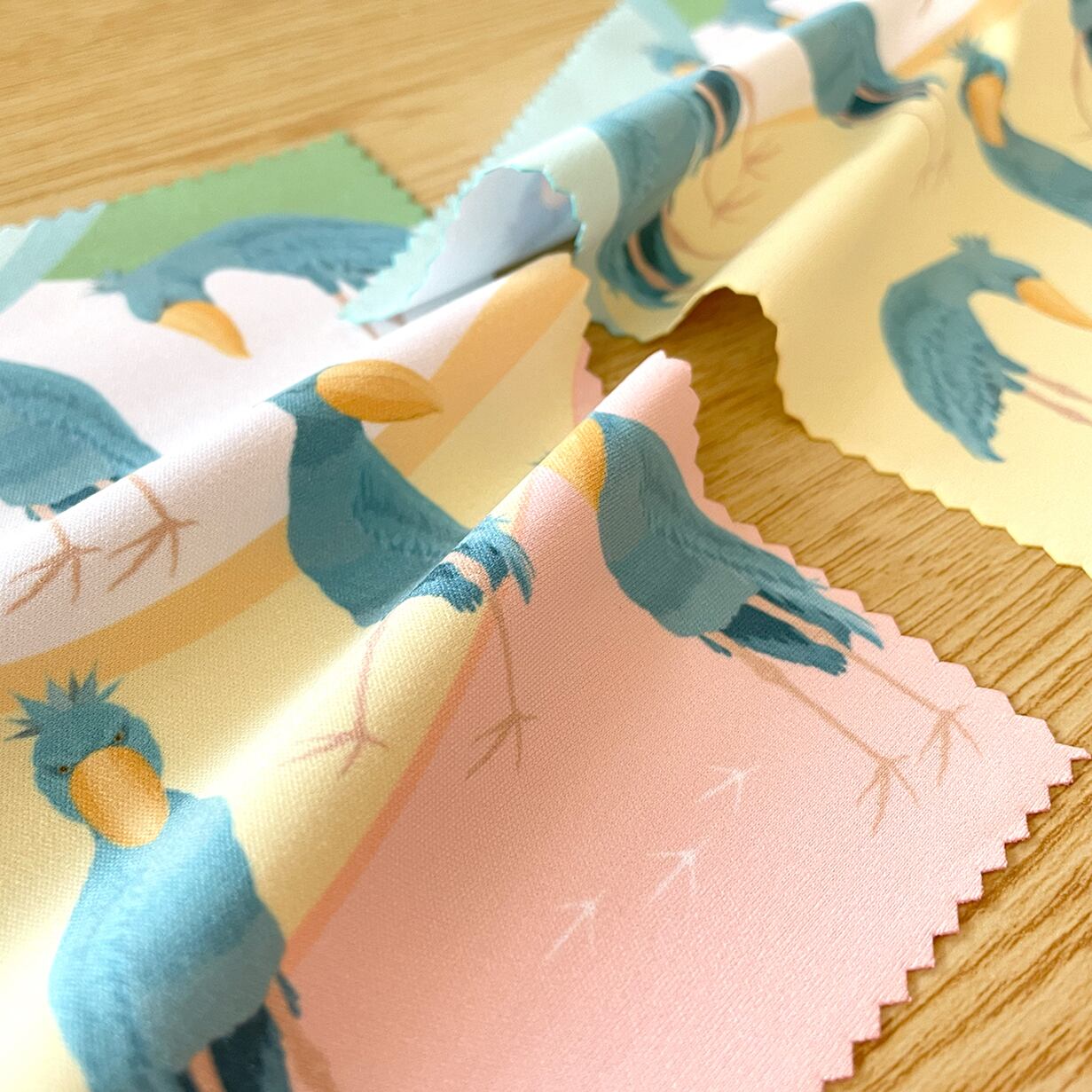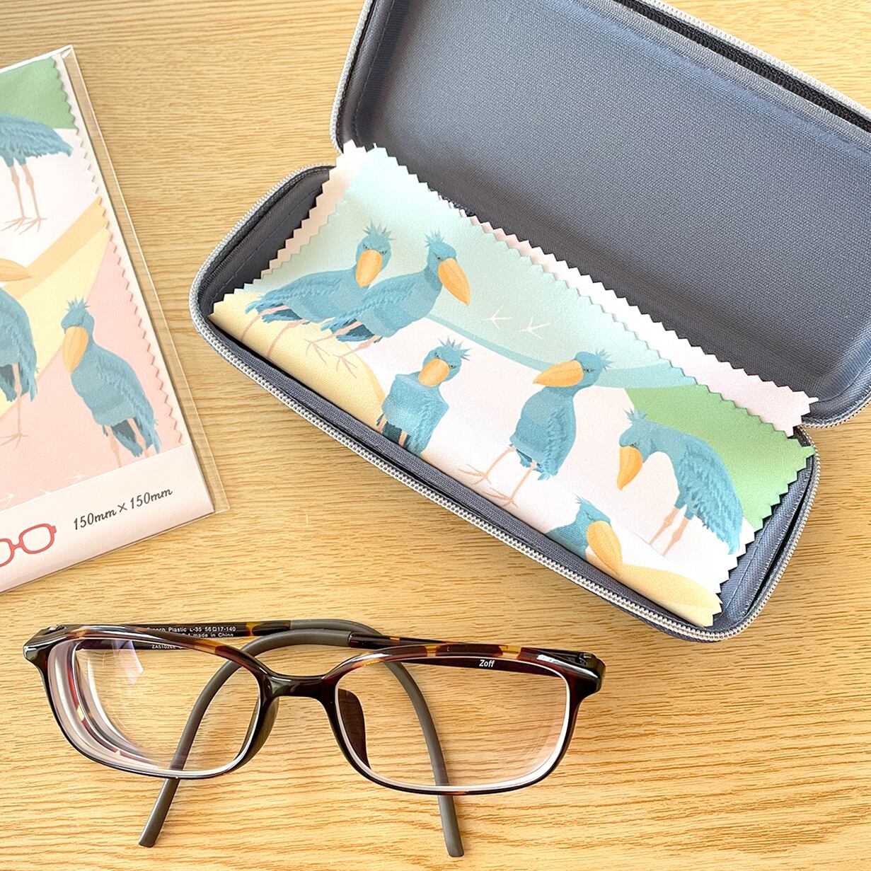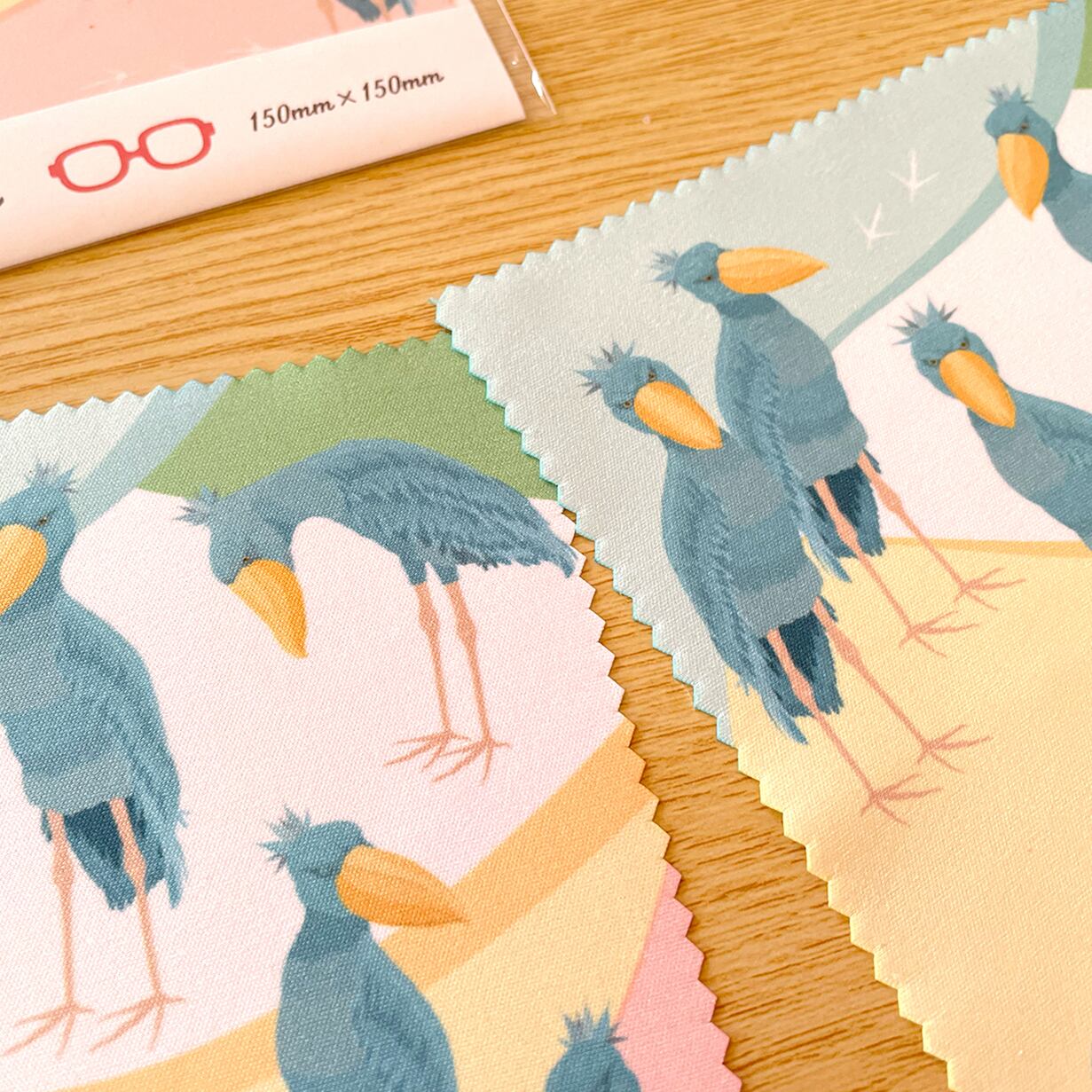 個性あふれるハシビロコウの姿をおしゃれに楽しめるメガネ拭きです。