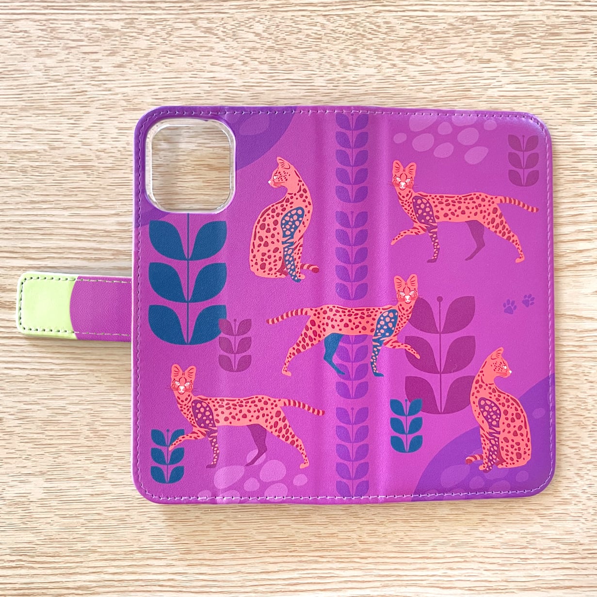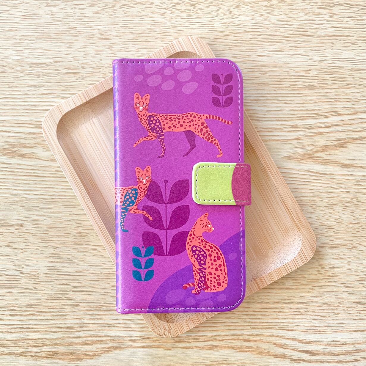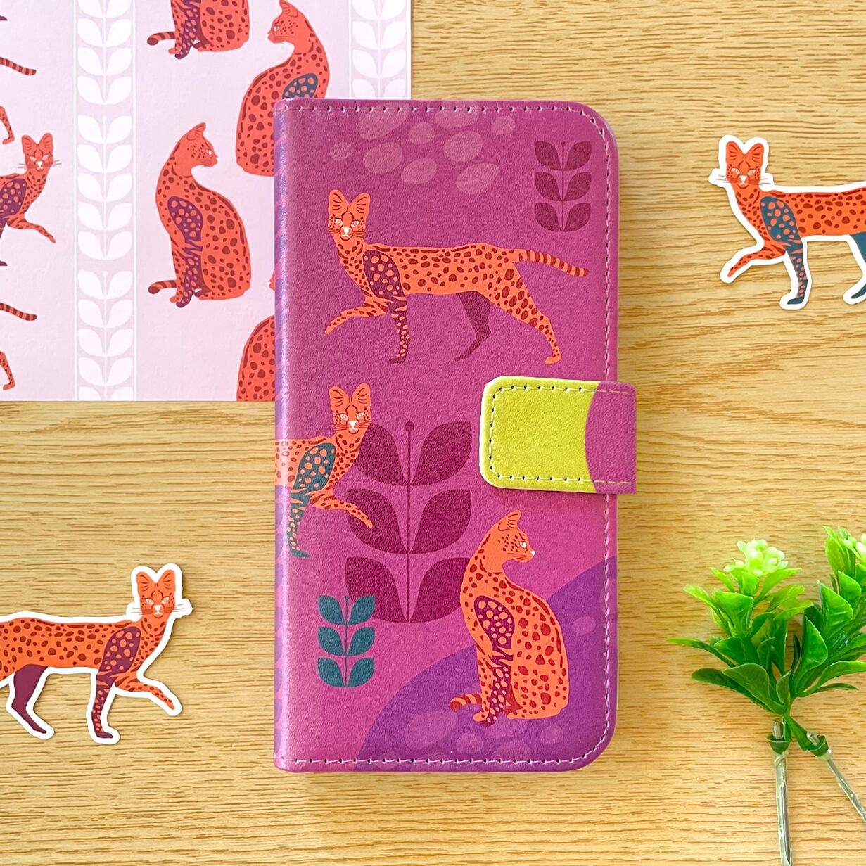 可愛らしいサーバルキャットの姿をおしゃれに楽しめるスマホケースです。