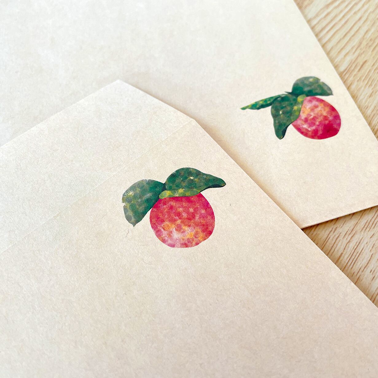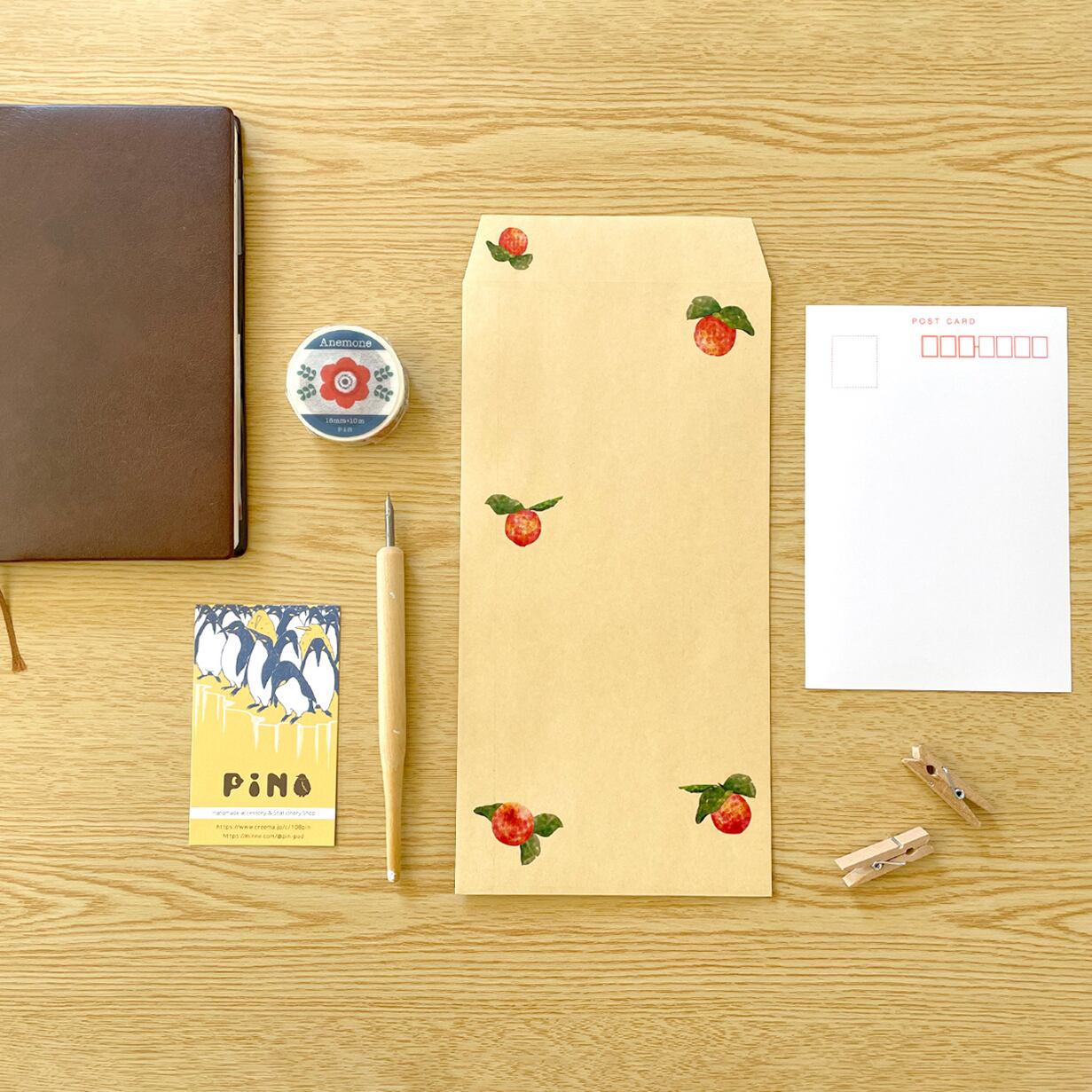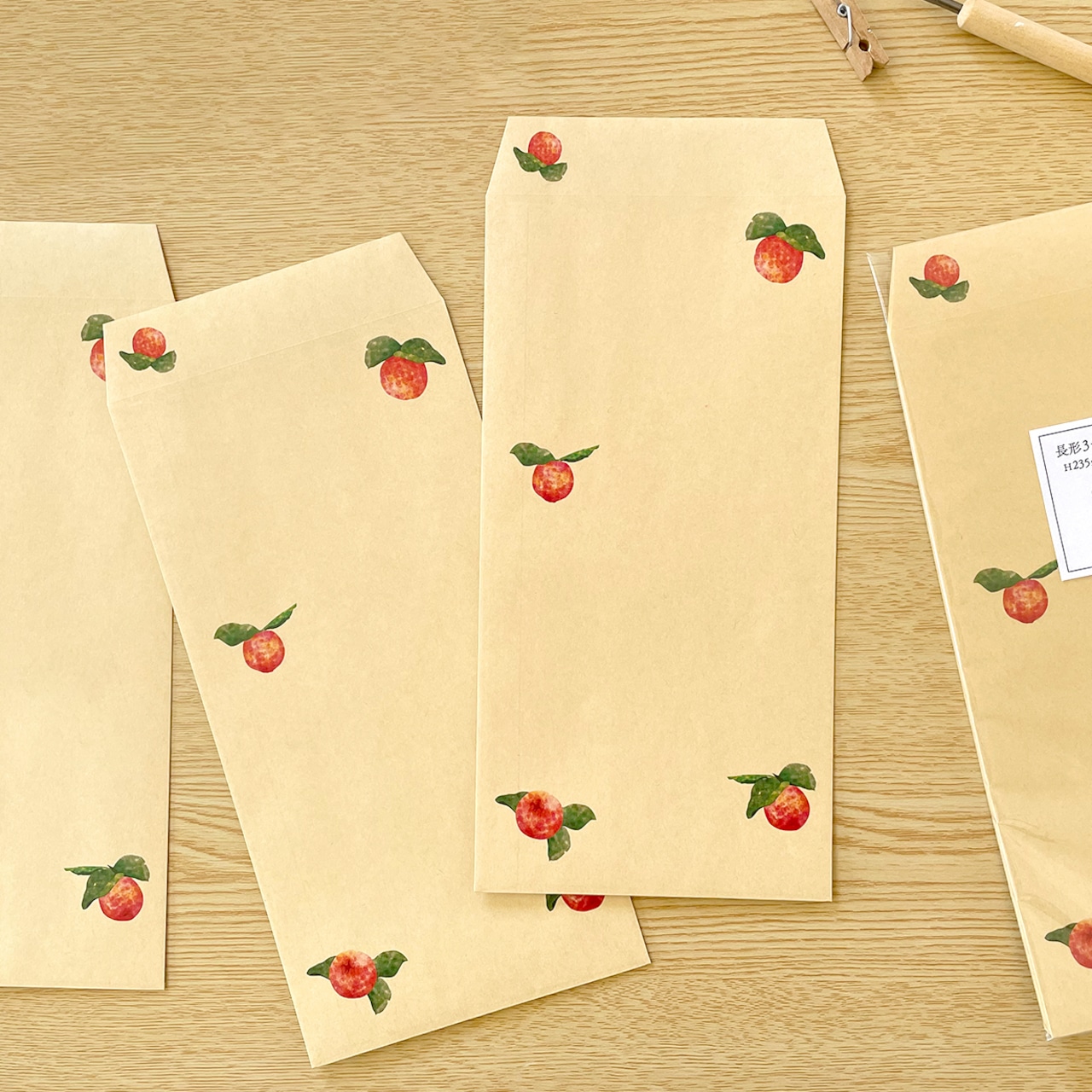 素朴なクラフト紙に、ころんとかわいいヒメリンゴをあしらった長3封筒です。