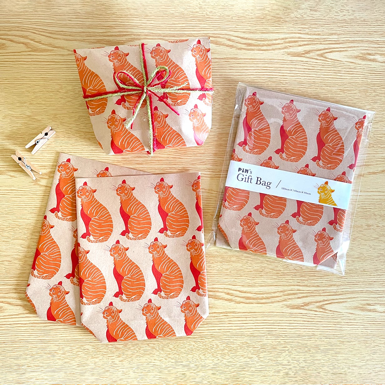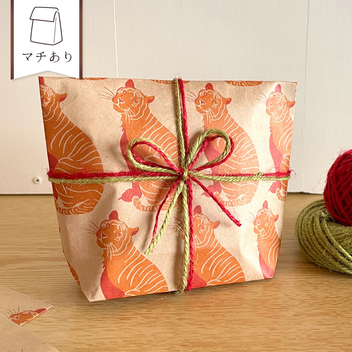 可愛らしい虎のイラストをプリントした紙袋で、贈り物を入れて封をするだけで素敵なプレゼントに。