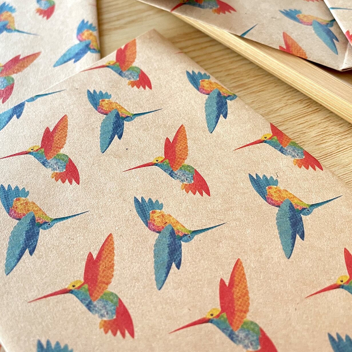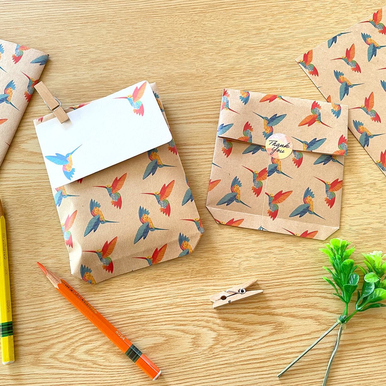 可愛らしいハチドリが羽ばたくカラフルなデザインで、贈り物を入れるだけでおしゃれなギフトに仕上がります。